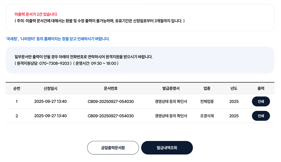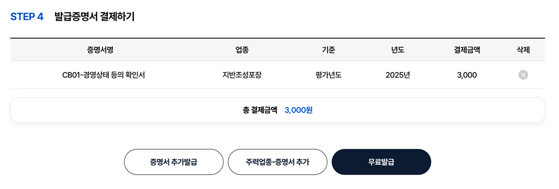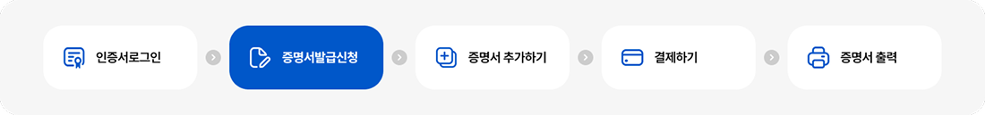 4. 필요한 경우 ‘증명서 추가발급’ 버튼을 클릭하여 추가한 후 결제단계를 거쳐 출력할 수 있는 다음 단계의 화면으로 이동합니다.